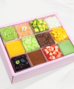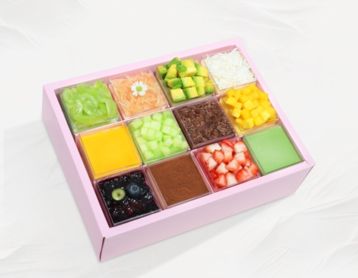 Ngay khi mở hộp, bạn sẽ ấn tượng với 12 ô bánh nhỏ xinh, màu sắc rực rỡ từ trái cây tươi tự nhiên. Từ xanh matcha, vàng xoài đến tím việt quất – tất cả tạo nên một hộp bánh đẹp mắt, cực kỳ “check-in”.